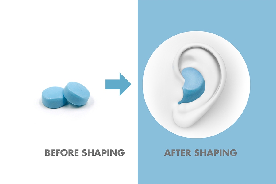 Before fitting, dry hand and ears. In your hands, roll the ear plug sinto a stretched oval shape. Hold the top of the ear and pull gently upwards and outwards to open the ear canal. Press down and hold your finger or thumb over the ear plug for 10-15 seconds, until it flattens and moulds to form a snug seal.