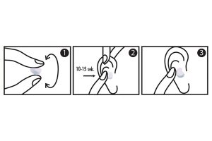 Przed każdym użyciem upewnij się, że ręce i uszu są suche. Roluj w ręce wkładkę do uszu aby osiągnąć owalny kształt. Wolną ręką chwyć lekko za ucho odchylając je w górę i nieco do tyłu aby nadać elastyczności przewodowi słuchowemu, ułatwi to włożenie wkładek. Umieść wkładkę w uchu. Następnie naciśnij lekko i przytrzymaj kciukiem wkładkę przez 10-15 sekund aby uzyskać odpowiednie dopasowanie i szczelność. Powtórz ten sam proces dla drugiej wkładki. Postępuj zgodnie z instrukcją