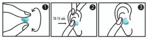 Przed każdym użyciem upewnij się, że ręce i uszu są suche. Roluj w ręce wkładkę do uszu aby osiągnąć owalny kształt. Wolną ręką chwyć lekko za ucho odchylając je w górę i nieco do tyłu aby nadać elastyczności przewodowi słuchowemu, ułatwi to włożenie wkładek. Umieść wkładkę w uchu. Następnie naciśnij lekko i przytrzymaj kciukiem wkładkę przez 10-15 sekund aby uzyskać odpowiednie dopasowanie i szczelność. Powtórz ten sam proces dla drugiej wkładki. Postępuj zgodnie z instrukcją